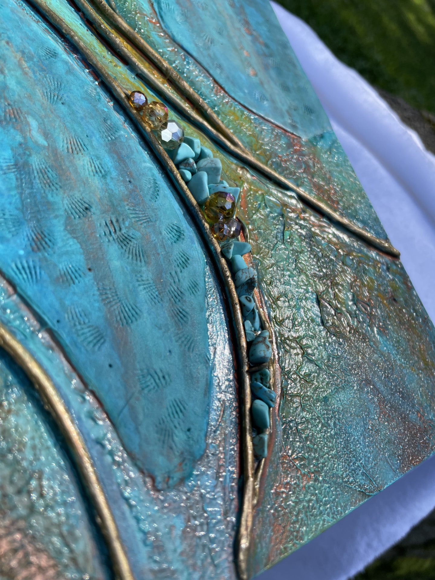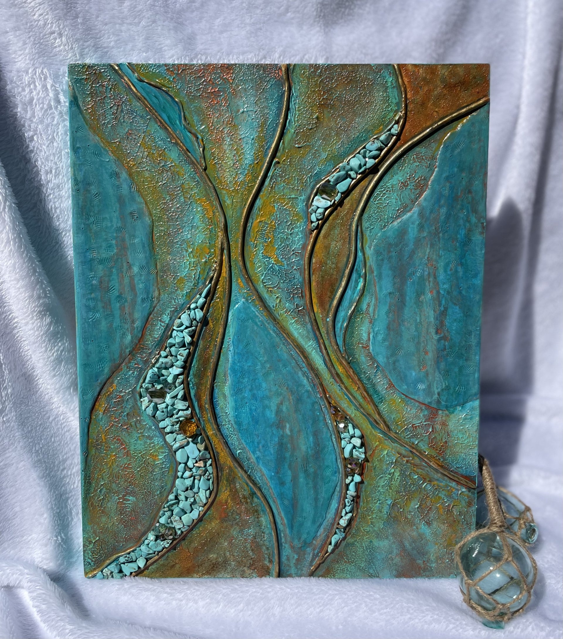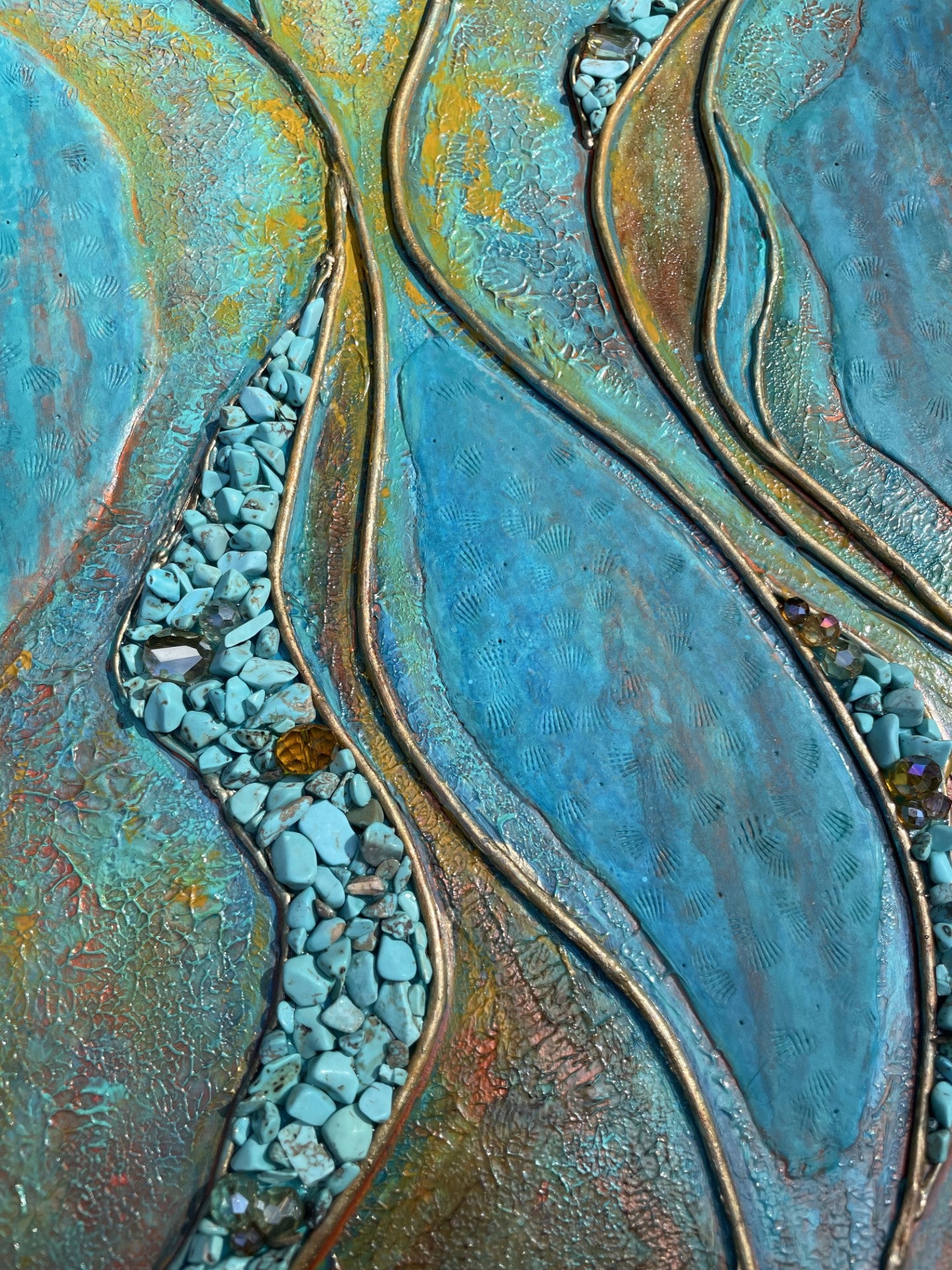 This stunning wall art combines turquoise acrylic with clay for a unique and modern look. Accents of gold, brown, and orange. Real turquoise chips and glass beads adorn this beauty as well. Contrasting finishes of matte and gloss make this piece truly unique. Lots of texture! This contemporary design is suitable for any interior, adding texture and elegance to any room. Get creative and make your own statement with this eye-catching piece.