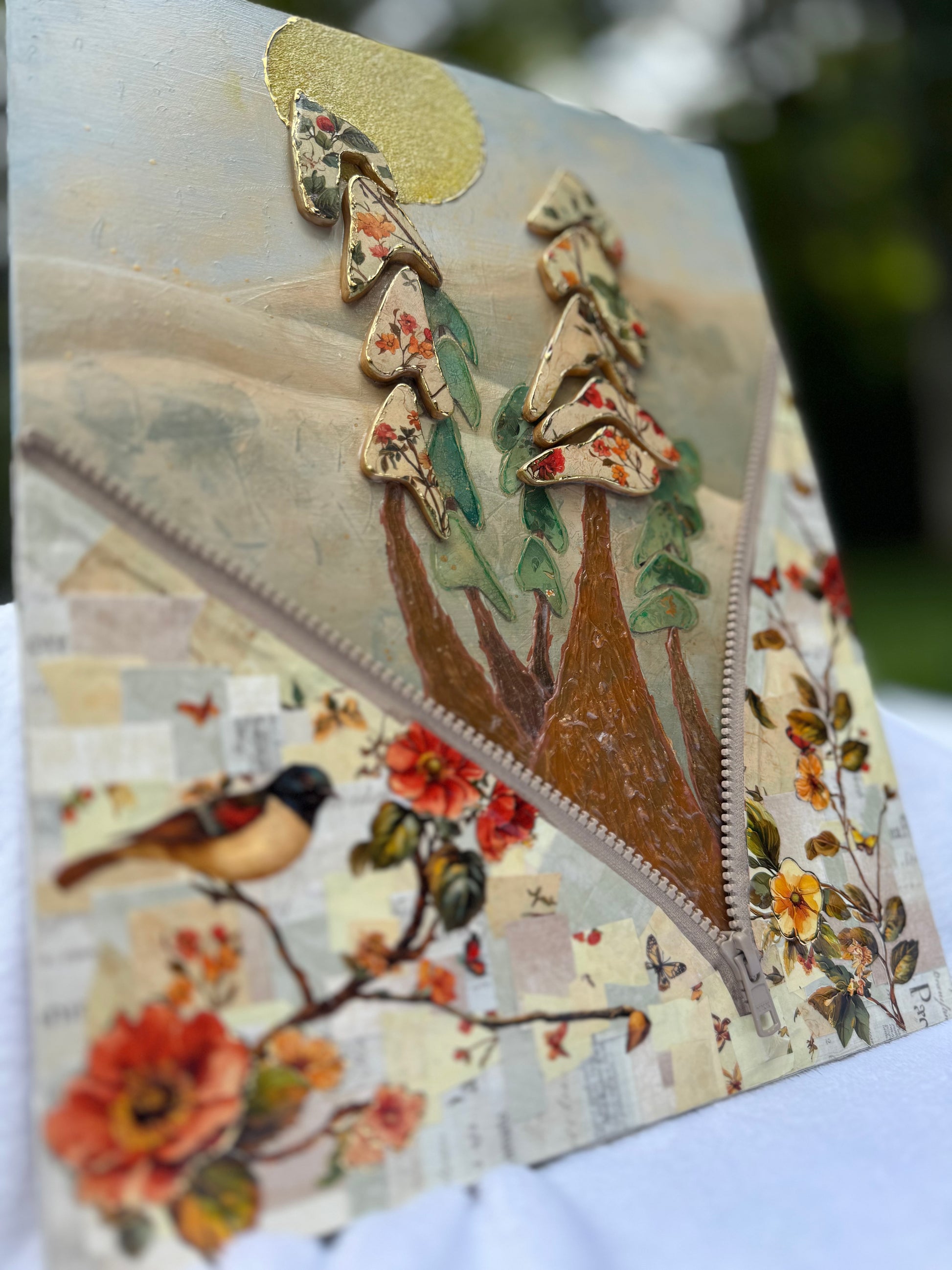 This captivating 3-dimensional art piece features whimsical hand-crafted clay trees, emerging from behind with the transformative Zipper Intervention technique. As the trees come to life, they evoke a sense of wonder, mystery, and growth, inviting you to experience the magic of nature unfolding before your eyes. Measuring 11x14" and ready to hang, this one-of-a-kind creation is not just a work of art, but an emotional journey—offering a rare blend of craftsmanship, beauty that will elevate any space with its heartfelt presence.
